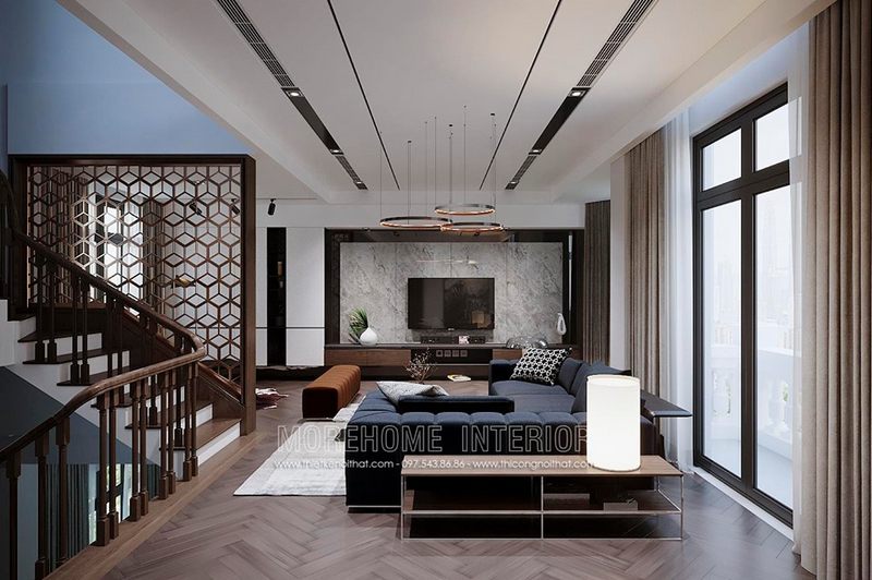 Trang trí nội thất phòng khách gỗ óc chó cao cấp tại Hà Nội, chỉ với sự kết hợp hài hòa 3 tone màu xanh coba - nâu trầm - be, KTS Morehome đã phác họa thành công nên một công trình bậc nhất hàng đầu hiện nay