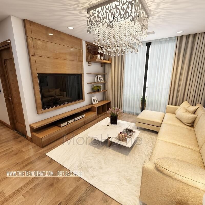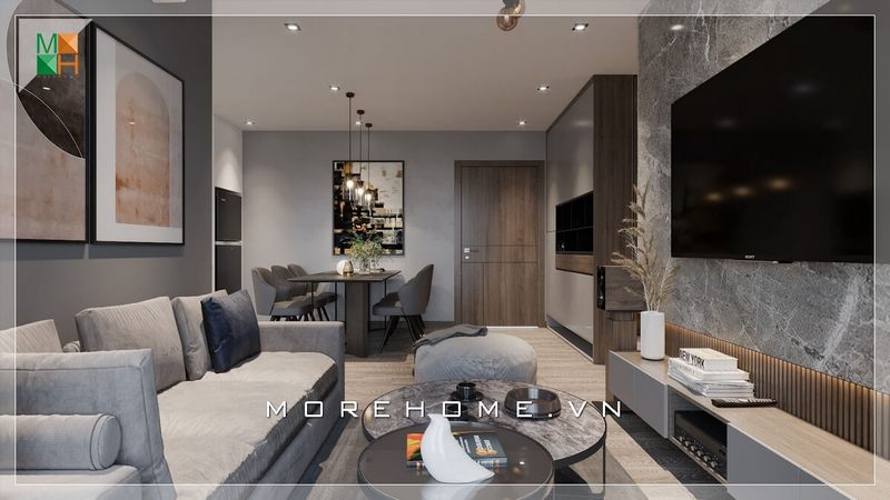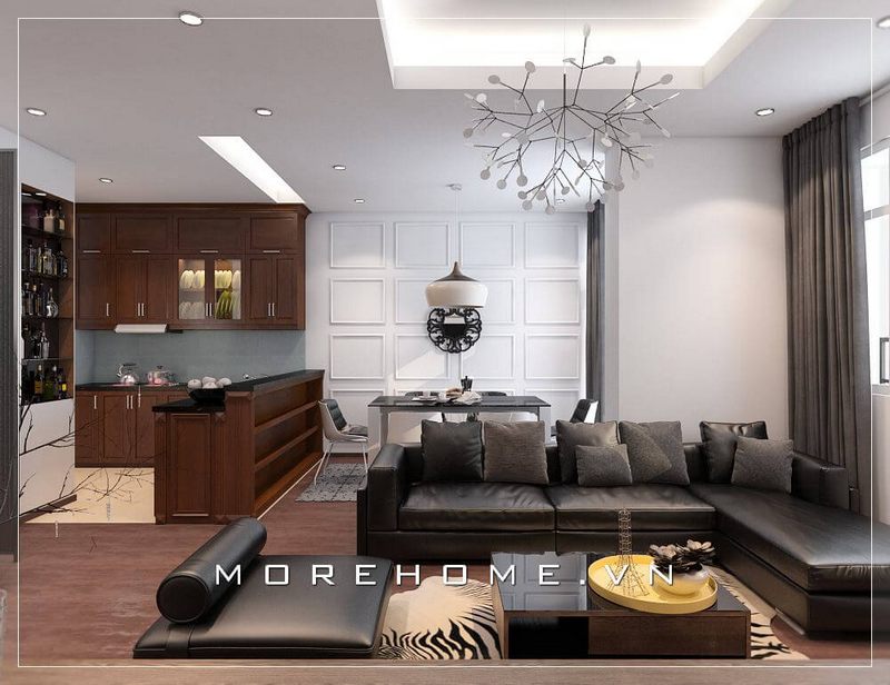 Trang trí nội thất phòng khách chung cư với đồ nội thất sử dụng tông màu veneer trầm mang đến sự trang trọng và hiện đại cho không gian nội thất.