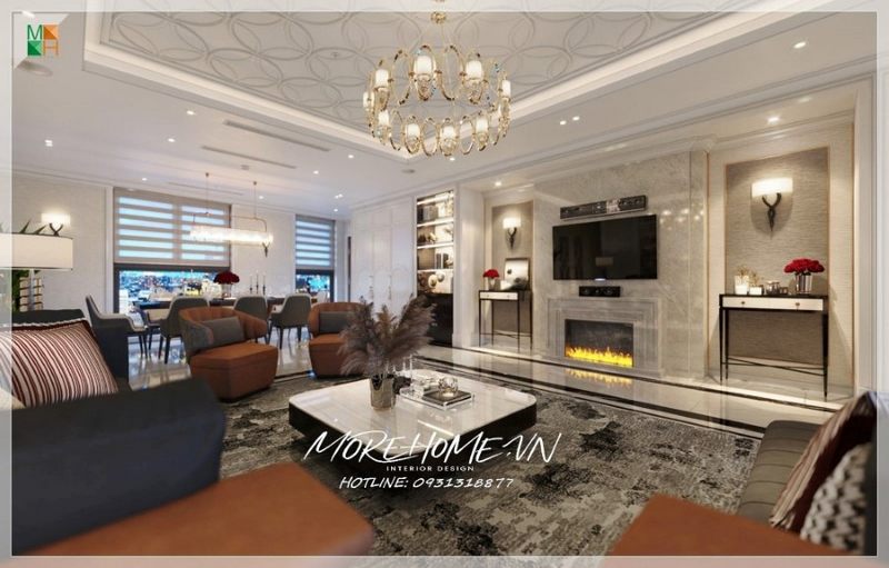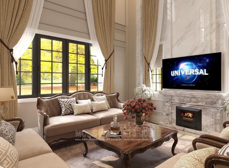 Sự khéo léo trong thiết kế nội thất phòng khách biệt thự tân cổ điển là những chạm khắc tinh xảo của trần nhà hay là kệ TV gỗ tự nhiên, vách tường của TV đến cách lựa chọn rèm cửa và đèn chùm treo trần, tất cả đều rất tinh tế và điêu luyện trong cách thiết kế.