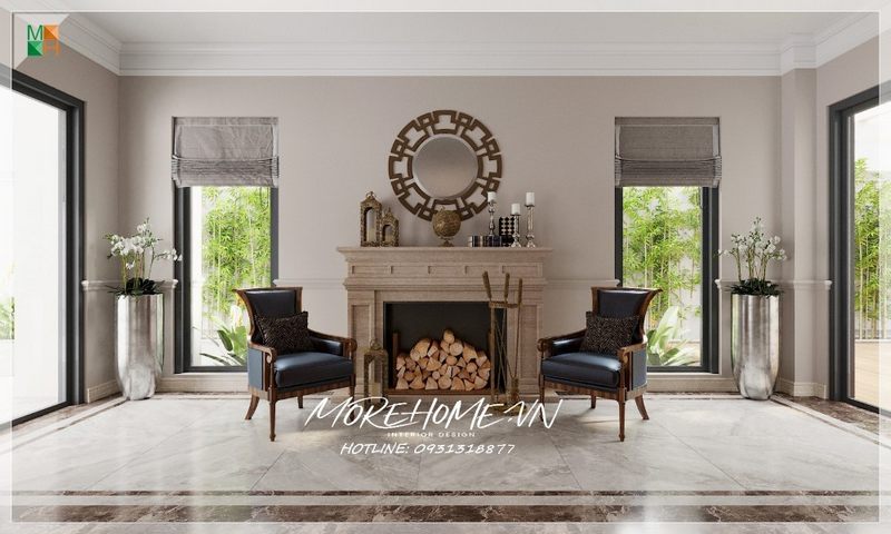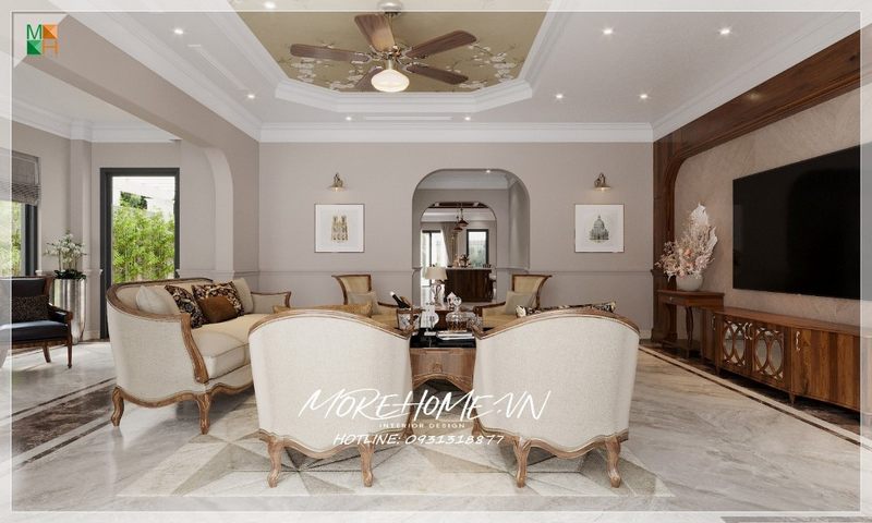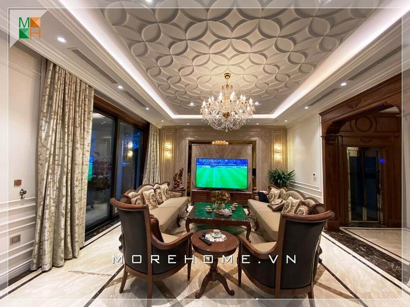 Phòng khách biệt thự theo phong cách tân cổ điển sự dụng hoa văn tròn làm điểm nhấn