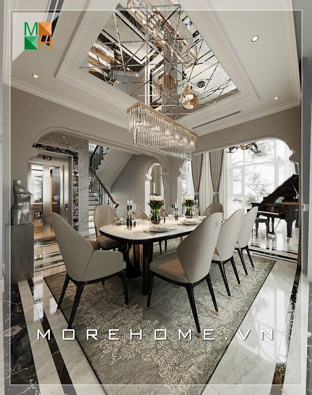 Xu hướng thiết kế phòng khách liền phòng ăn rất được ưa chuộng hiện nay. Hệ thống trần giật cấp và đèn chùm được thiết kế và bố trí ở các gian phòng khác nhau, như một cách để phân chia khu vực sinh hoạt