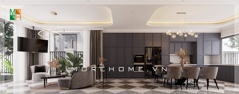 Đẹp mãn nhãn với mẫu thiết kế phòng khách liền phòng ăn với nột thất tông màu ghi xám cao cấp, sang trọng dành cho biệt thự phong cách tân cổ điển