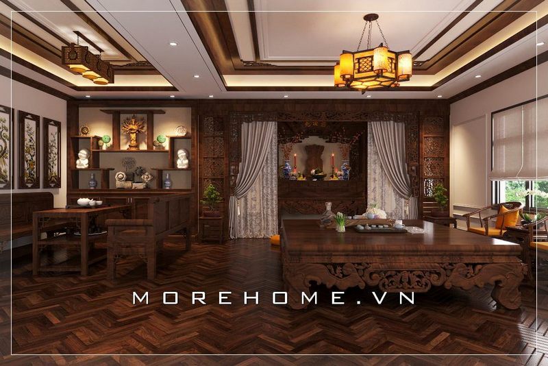Khi bước vào căn phòng thờ biệt thự sang trọng với nội thất gỗ óc chó cao cấp, người xem sẽ bị ngỡ ngàng trước vẻ đẹp của không gian.