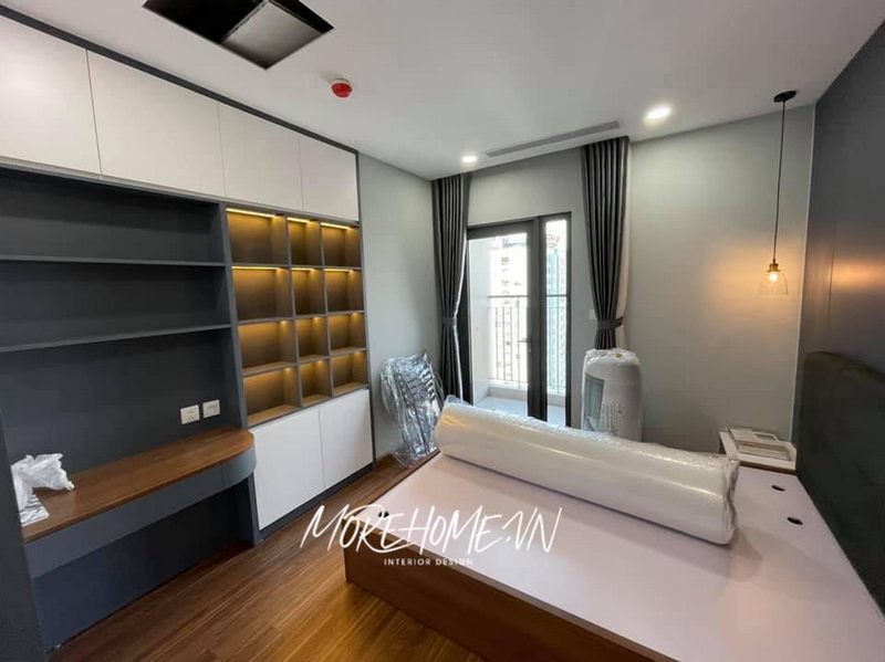 Căn phòng ngủ chung cư được sử dụng nhiều từ các chất liệu gỗ được thi công hoàn thiện từ bản vẽ thiết kế của các kiến trúc sư Morehome tạo cho gia chủ cảm giác mát mẻ cho mùa hè và ấm áp cho mùa đông.