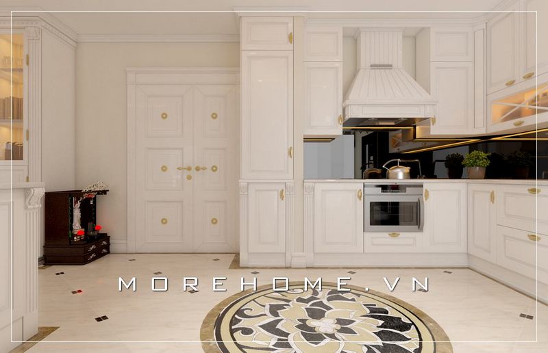 Mẫu thiết kế nội thất phòng bếp gỗ tự nhiên với tone màu trắng theo phong cách tân cổ điển sang trọng và tinh tế.