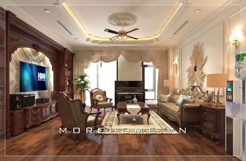 Thiết kế nội thất phòng khách biệt thự có phong cách kết hợp giữa tân cổ điển và sang trọng đẳng cấp.